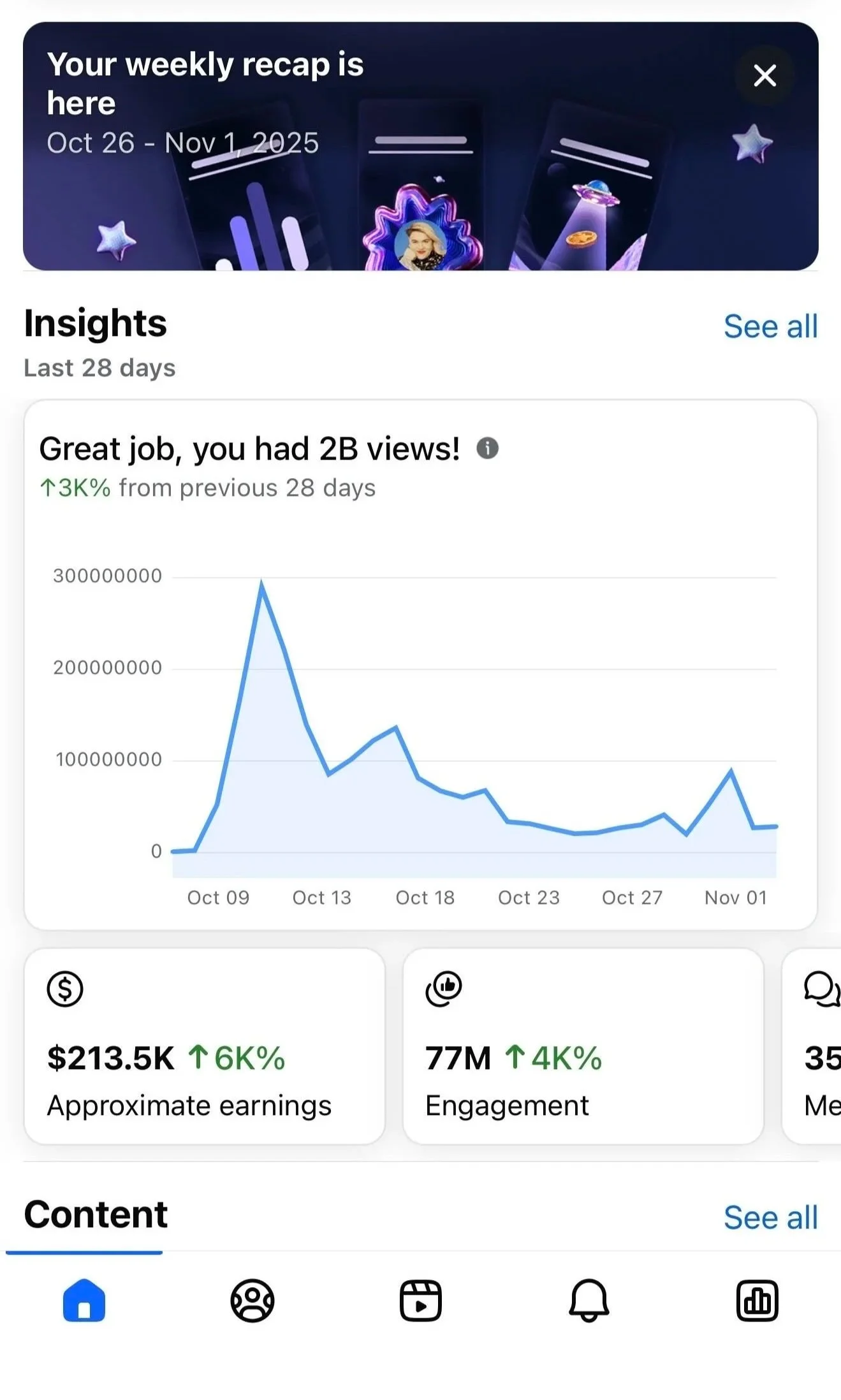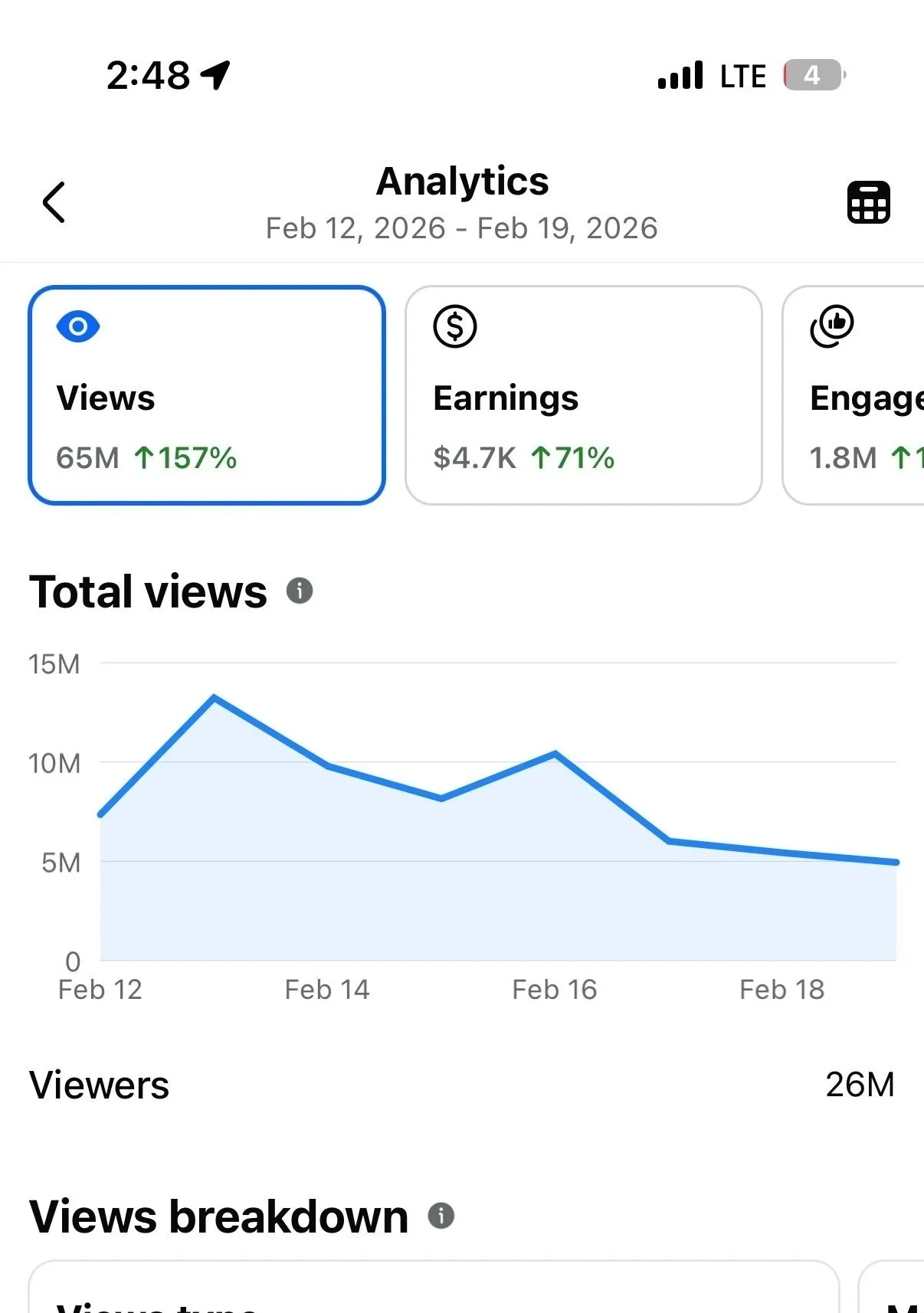 This week alone, my content generated 65 million views. At this pace, that trajectory projects to 3.4 billion views this year.